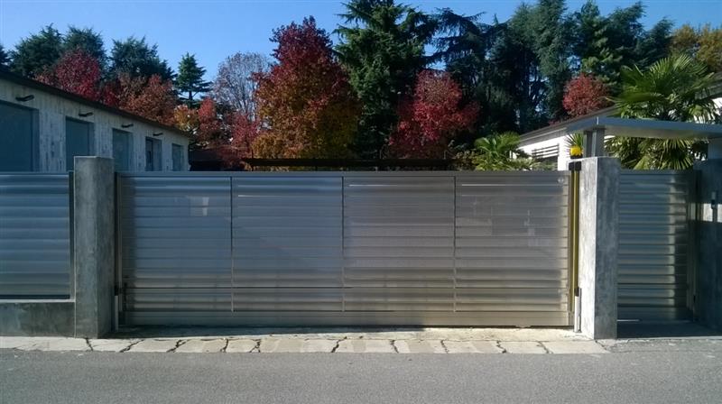 Telaio perimetrale in tubolare 60x60 o 80x80. Tamponatura con tubolari verticali 40x20 e orizzontali diametro 25 con inserite doghe in acciaio inox microforate .
